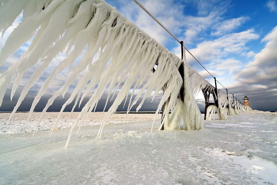 Dark skies split dramatically over the ice-covered pier at the Manistee Lighthouse.