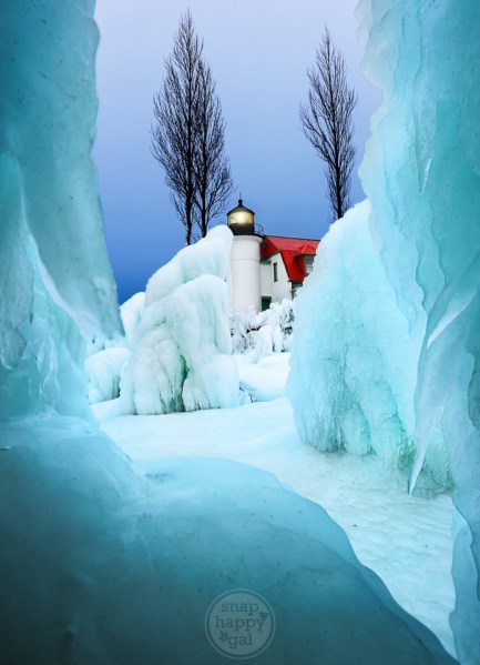 Blue Ice Framed Betsie – Mounds of blue-green ice stack up around the Point Betsie Lighthouse