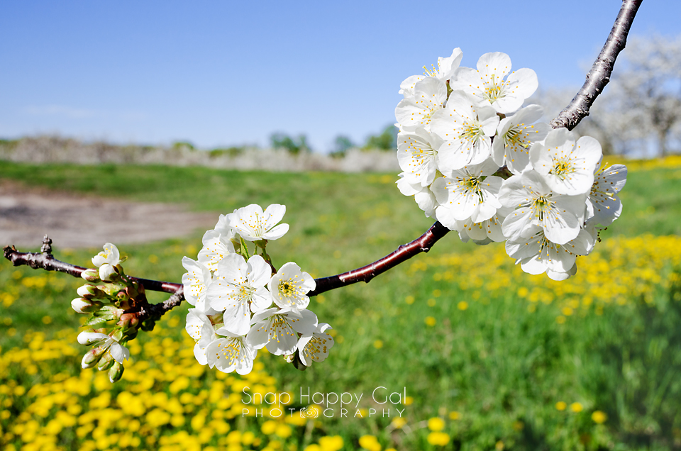 A closer view of a bunch of cherry blossoms on a single branch in front of the whole orchard