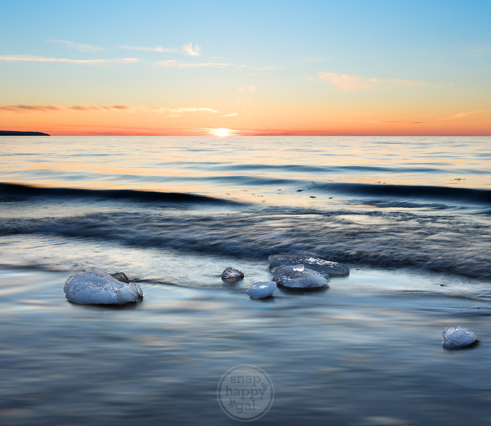 Chunks of crystalline ice sit in Lake Michigan’s shallows during an orange and blue sunset