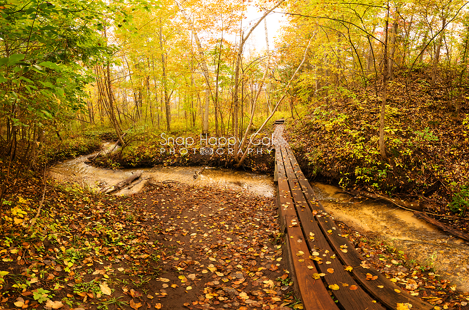 Winding stream, narrow path, golden leaves. Beautiful fall.