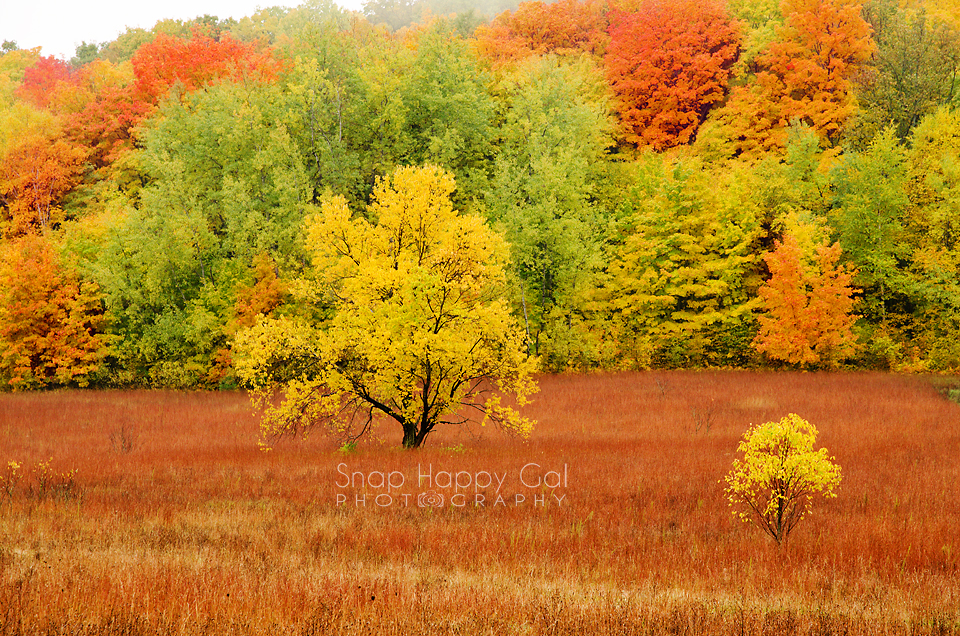 Two golden trees stand out against a colorful fall backdrop in the Michigan countryside.