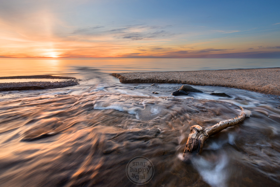 The Upper Peninsula’s (Michigan) Hurricane River flows past some driftwood into Lake Superior at sunset