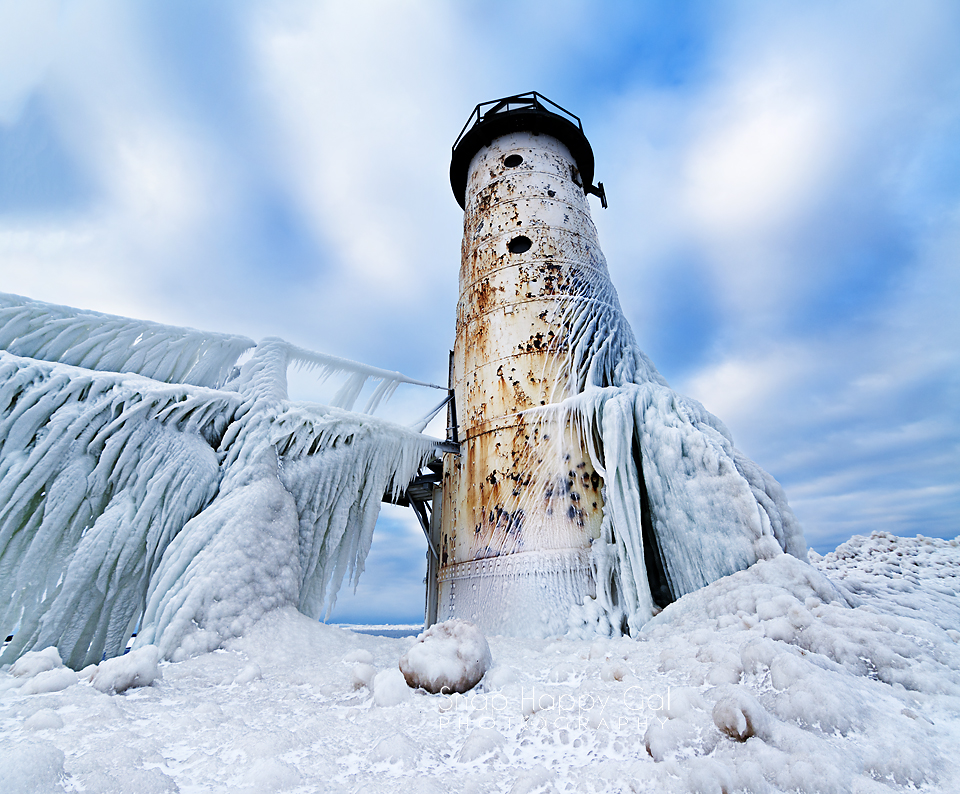 Winter’s gnarly ice clings to the rust-flecked Manistee Lighthouse.