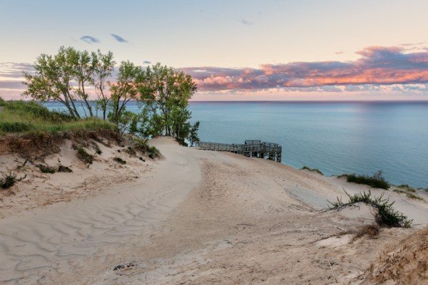 Post-storm clouds catch sunrise highlights over the main Lake Michigan overlook in the Sleeping Bear Dunes