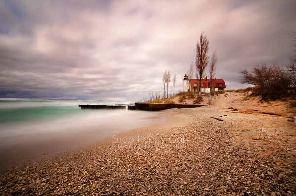 A long exposure smooths Lake Michigan at the Point Betsie Lighthouse.