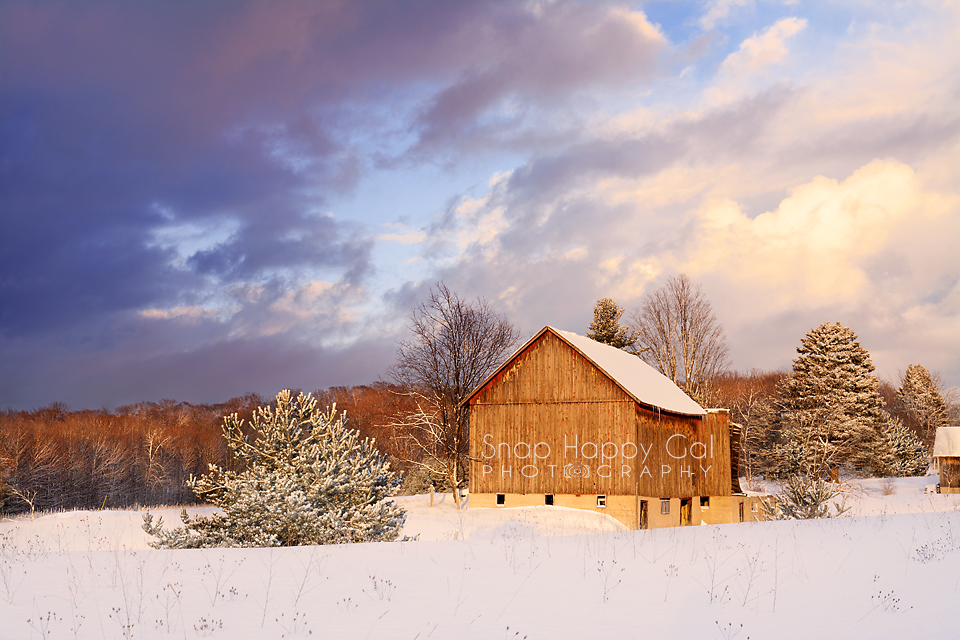 Snow covered barn catches the warm light of sunset.