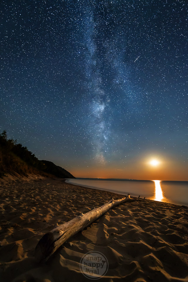 The Milky Way, several meteors and a setting moon make a memorable moment together on Empire Beach