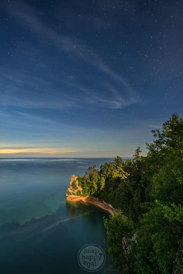Moonlight and twilight collide in this starry night image of Miners Castle in the Pictured Rocks National Lakeshore; Upper Peninsula, Michigan