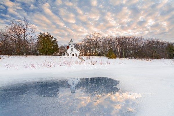 Mission Point Lighthouse Reflects in a winter puddle.