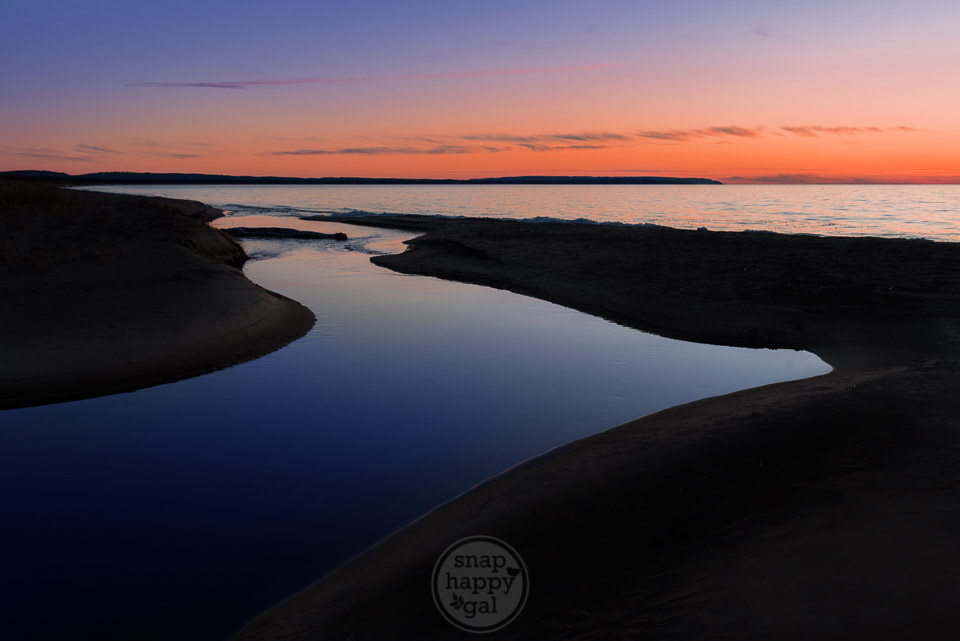 Esch Beach in silhouette with Otter Creek reflecting faint sunset afterglow