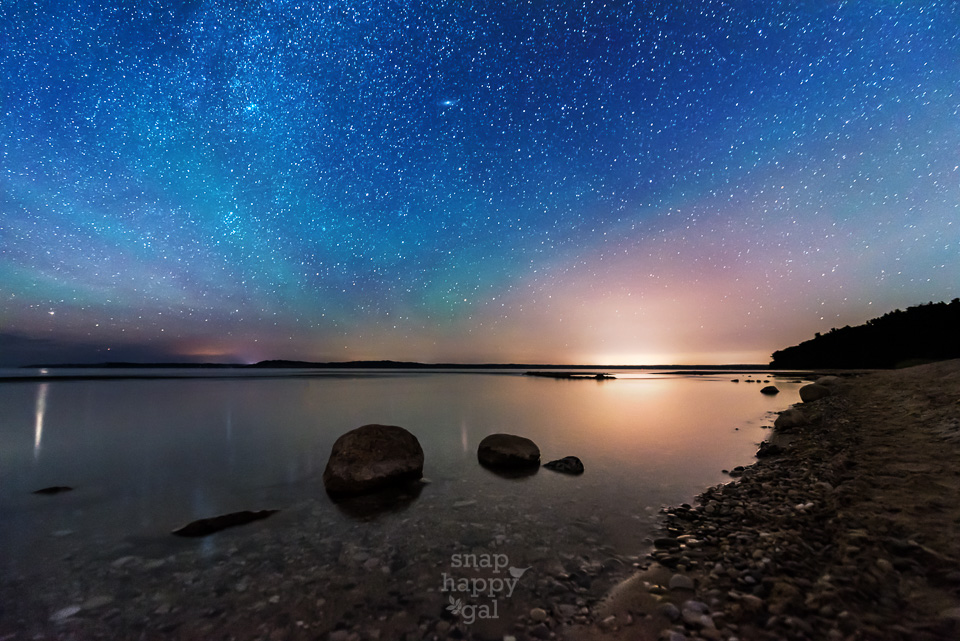 Aurora Borealis activity and air glow color the night sky turquoise over Platte Point on Lake Michigan