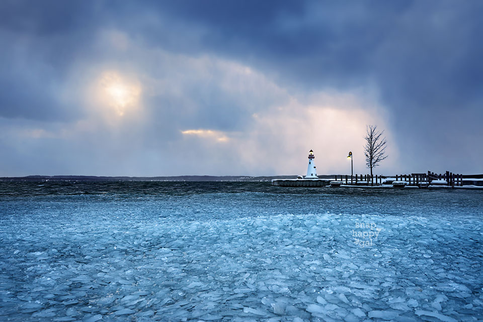 Torch Lake ice shards surround the new Alden Lighthouse under lake effect skies