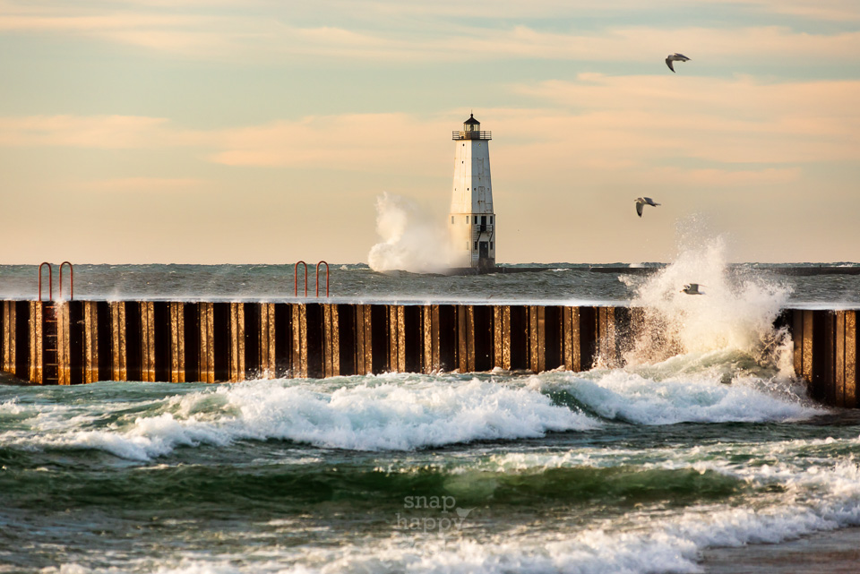 Seagulls and crashing waves adorn the Frankfort Lighthouse in late afternoon sun