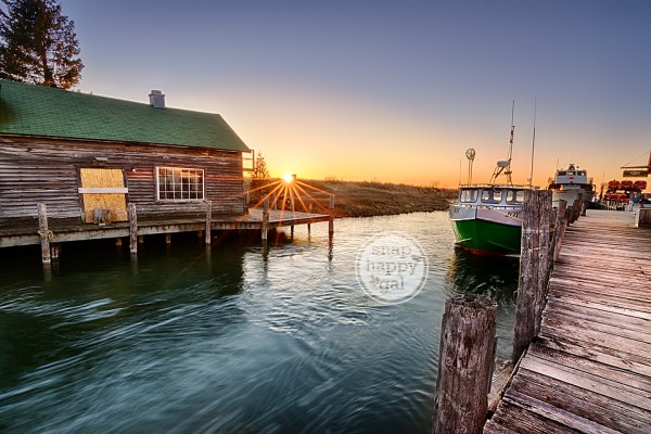Photo: Boats sit at the dock in the Leland River in Fishtown at sunset.