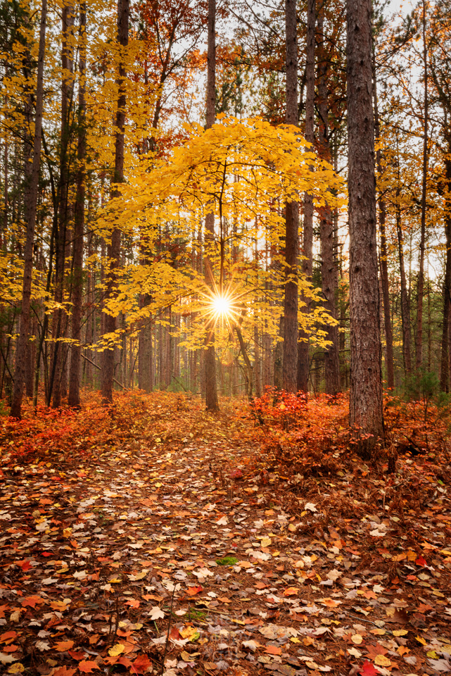 The sun bursts through a single yellow maple tree set amid a forest of pines