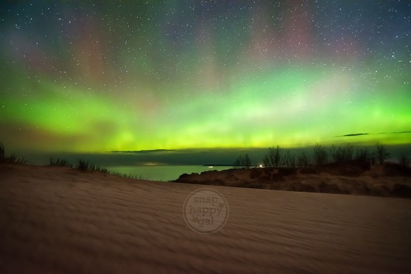 Northern Lights glow vividly over the shifting sands of Michigan’s Sleeping Bear Dunes