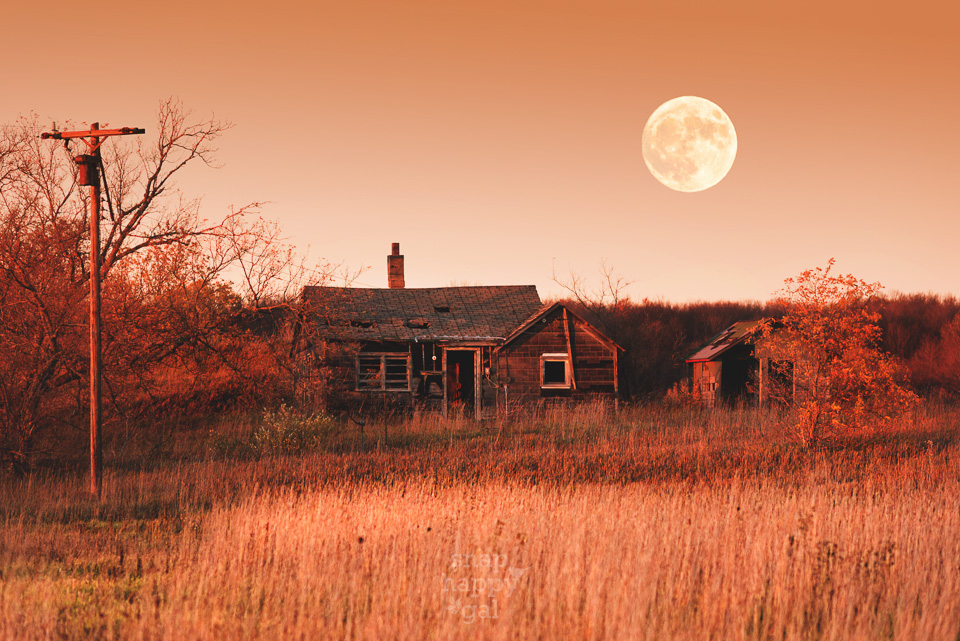 A full moon looms over a decaying Leelanau homestead in red sunset light