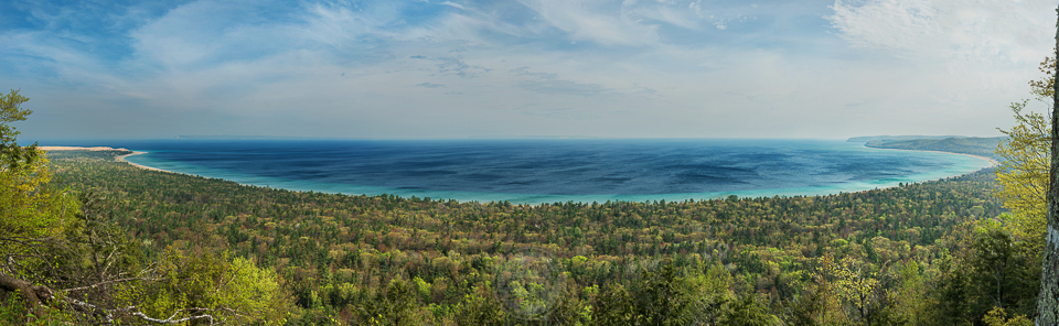 A sweeping view of Sleeping Bear Bay in Lake Michigan as viewed from Alligator Hill