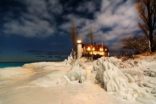 Starry skies and ice formations adorn the beautiful Point Betsie Lighthouse on a cold winter night.