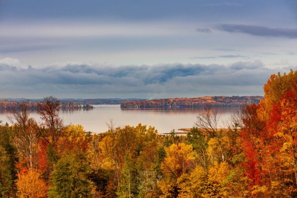 Brilliant fall colors surround a still Lake Skegemog on a moody autumn day
