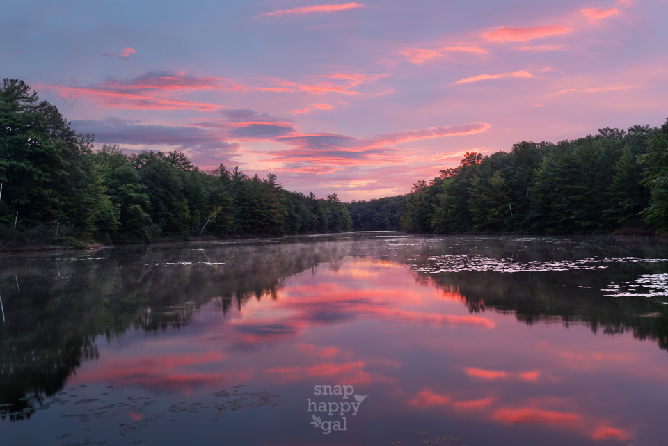 A colorful sunrise reflects in this still lake in northern Michigan