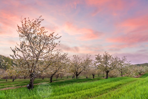 Sweet cherry orchard in bloom, Leelanau County, Michigan