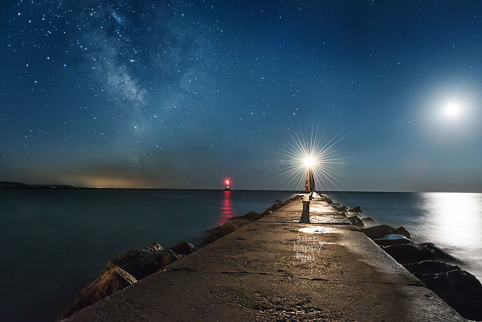 The lighthouse in Frankfort Michigan lights up its wave-lapped pier under the shimmering Milky Way