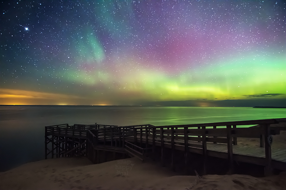 The northern lights dance over the big Lake Michigan overlook in the Sleeping Bear Dunes