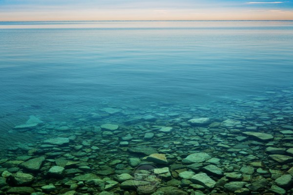 The rocky bottom stands out near a breakwall in Elberta, Michigan on a calm day