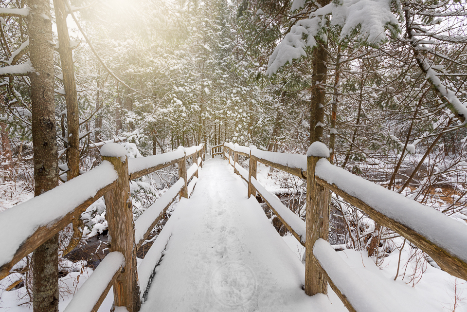A snowy footbridge crosses a tributary to the Boardman River south of Traverse City