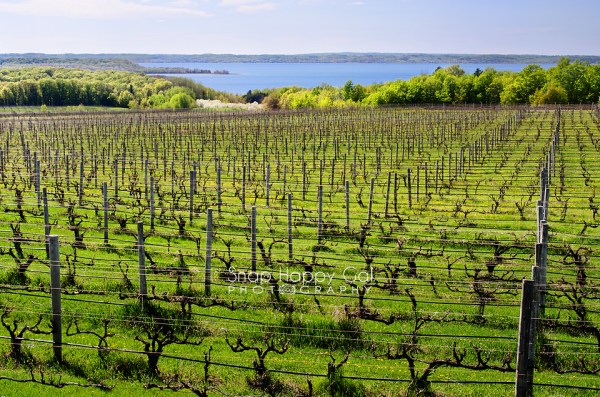 View of West Bay as seen over the rows of a vineyard.