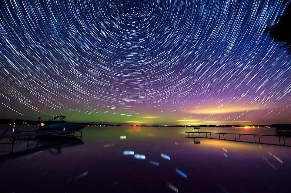 Stars circle above an aurora filled night sky overlooking Alden, Michigan.