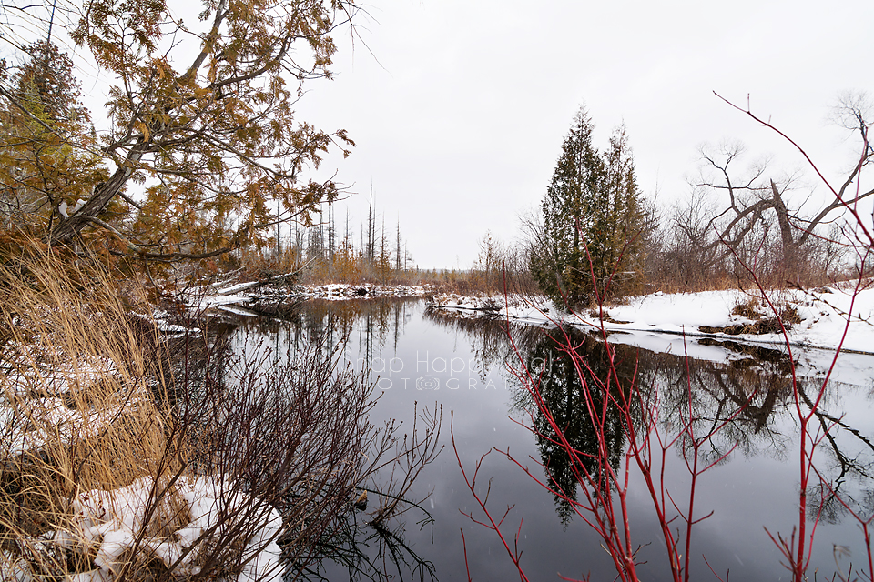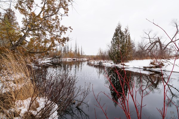 Red reeds and snow line the calm, reflective Platte River.