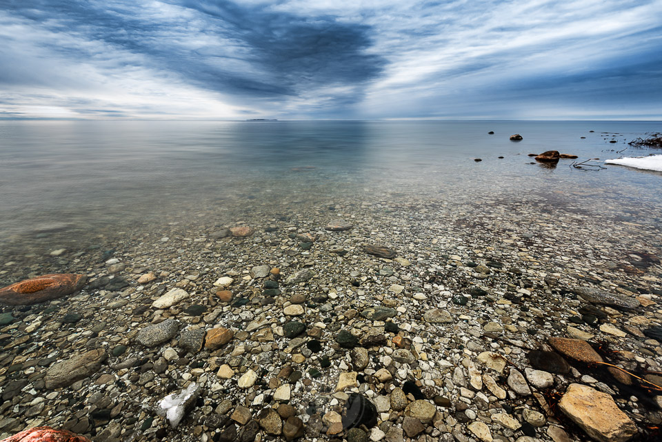 Rocky shallows in an eerily calm Lake Michigan on a moody day in Northport