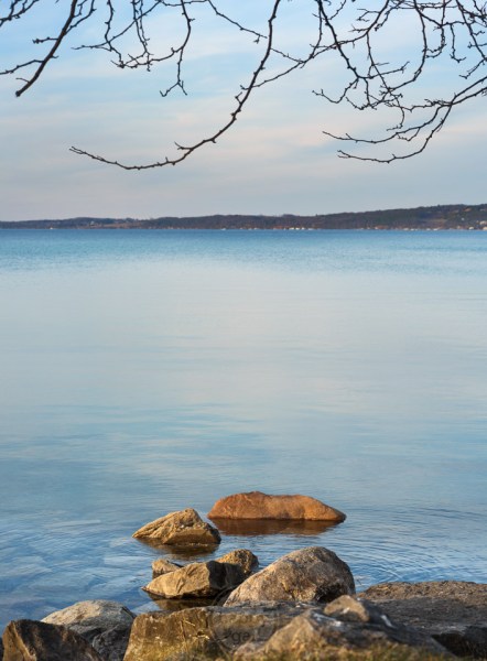 Smooth Lake Michigan waters dotted with stones and framed by branches